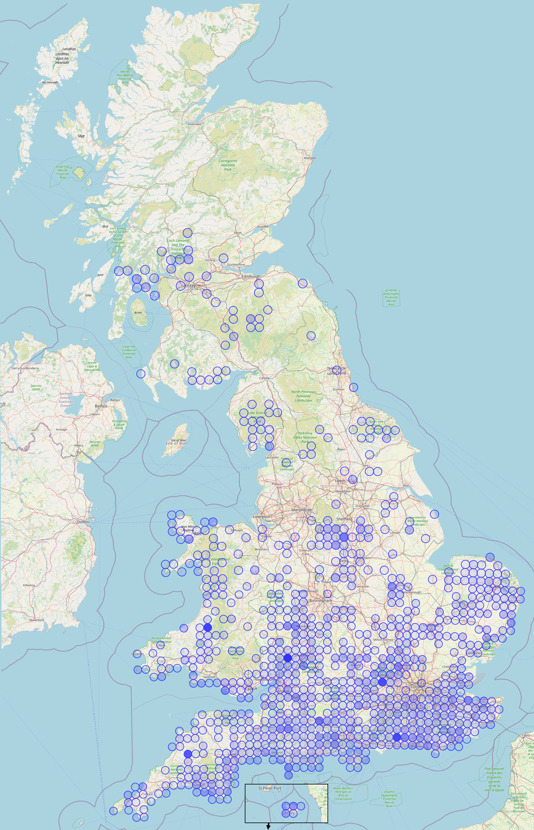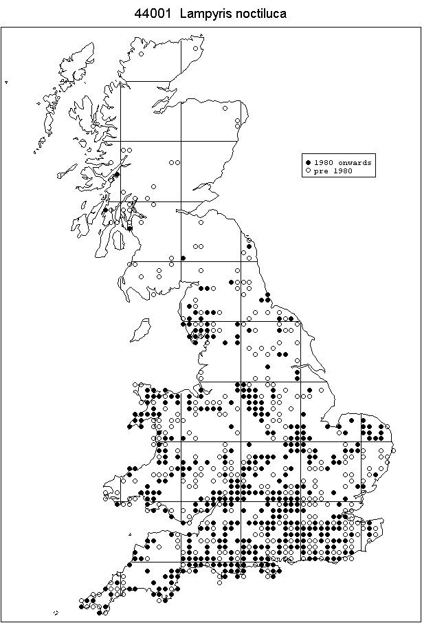 Click here to see a UK distribution map published in 2007 by the Biological Records Centre, which is the official recording centre for all UK species. It also shows pre-1980 records. In recent years many more sightings have been recorded, and for a detailed map of sites reported to iRecord since 2011, see this up-to-date map produced in early 2024. There is also an old list of UK sites in the historical county-by-county lists. To access a detailed map and listing of recently recorded sites near to you, register with iRecord, and on the Explore menu filter results by Lampyris noctiluca.