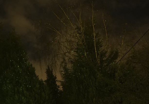 'Firefly' laser projection. Glow worms don't live in trees! Pic: Robin Scagell (and projector owner!)